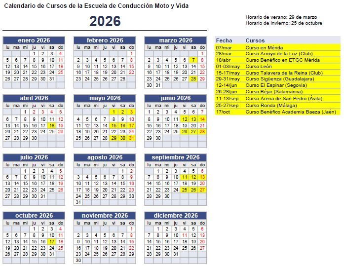 CALENDARIO DE CURSOS PARA LA TEMPORADA 2026