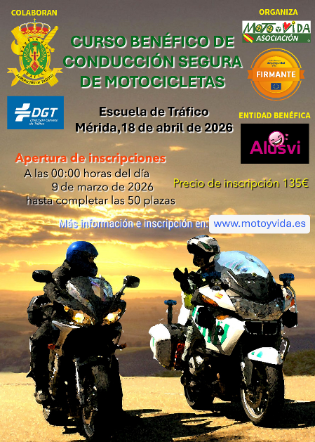 La Escuela de Tráfico acogerá el 18 de abril de 2026 un Curso Benéfico de Conducción Segura de motocicletas, que organiza la Asociación Moto y Vida, en colaboración con la Agrupación de Tráfico de la Guardia Civil y la Dirección General de Tráfico, una jornada muy especial de formación, compromiso y solidaridad, ya que tendrá carácter benéfico, y su recaudación irá destinando a la Asociación Lucha y Sonríe por la Vida. una entidad sin ánimo de lucro que trabaja por la autoestima y la calidad de vida de personas afectadas por la enfermedad del cáncer y sus familias.