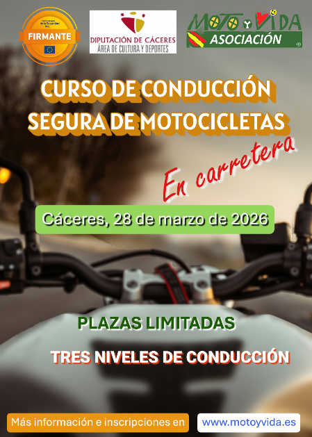 En Cáceres, el 28 de marzo de 2026 se impartirá un Curso de Conducción Segura de motocicletas. Este curso estaba programado en el calendario para Arroyo de la Luz (Cáceres) pero por problemas logísticos se ha cambiado de ubicación.
