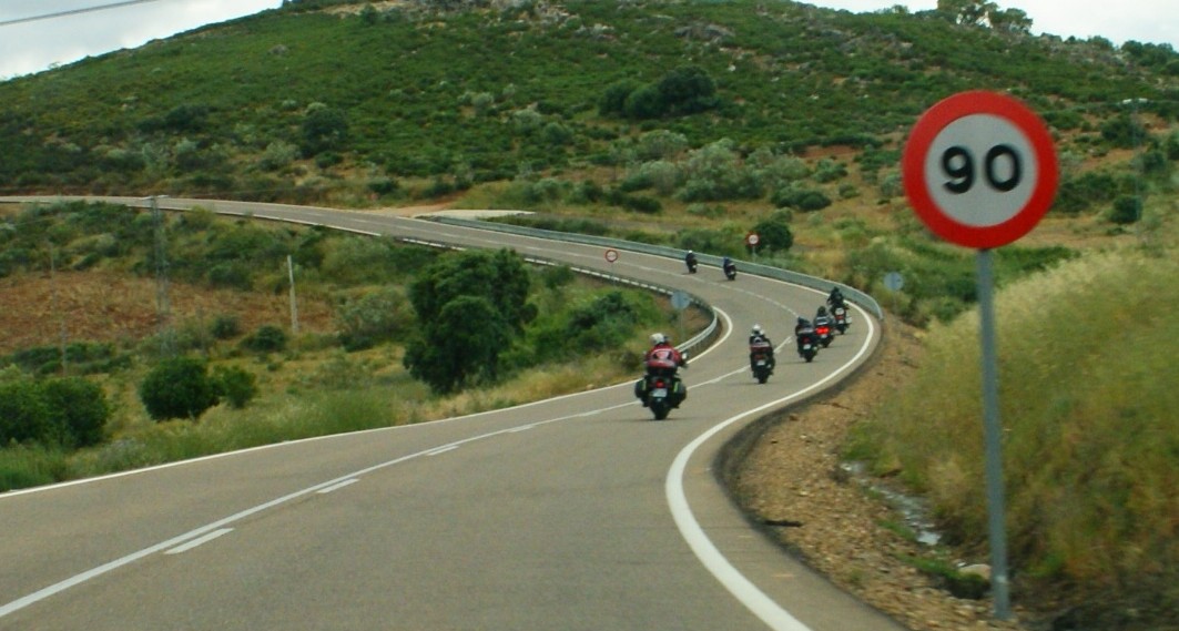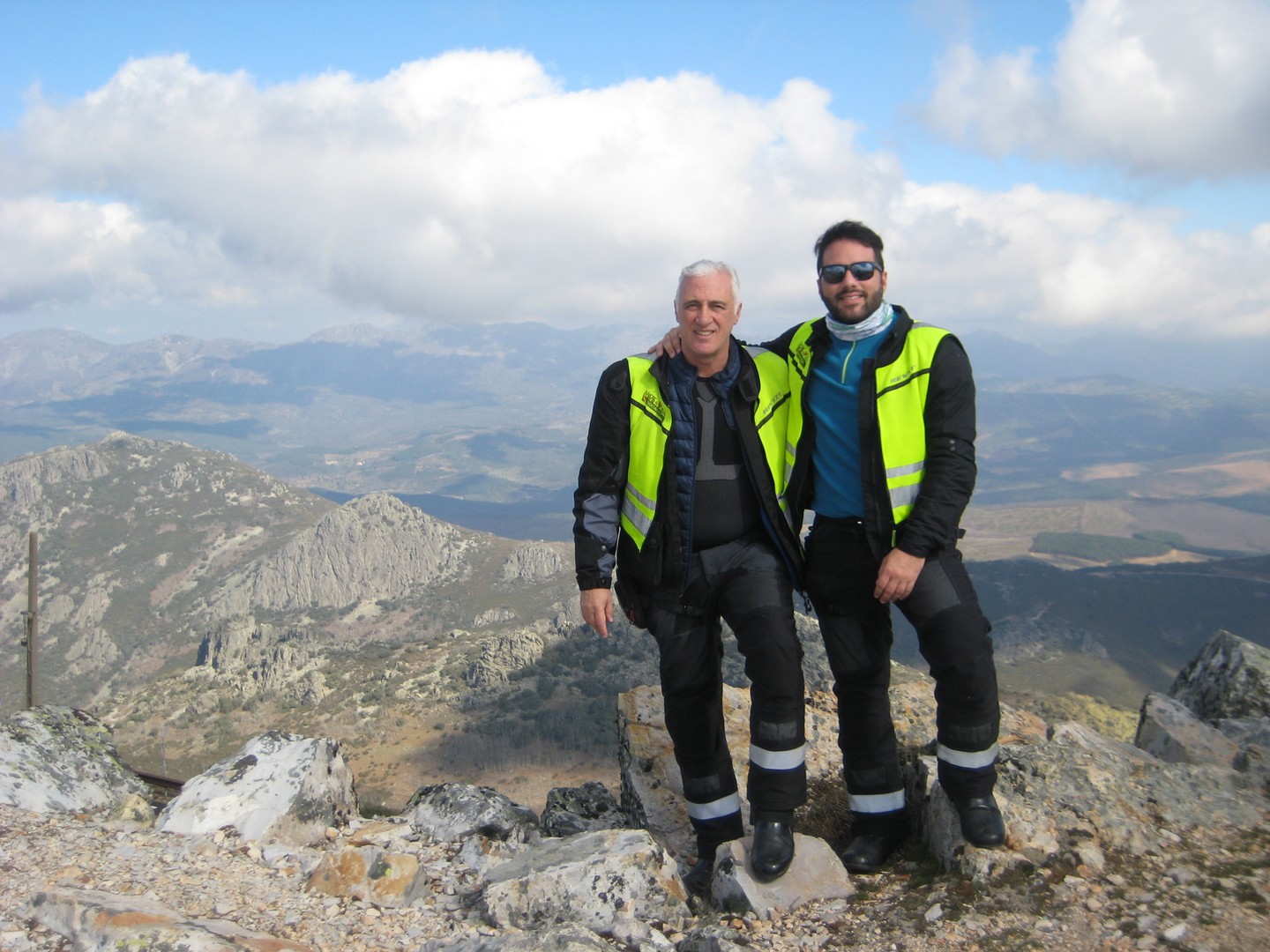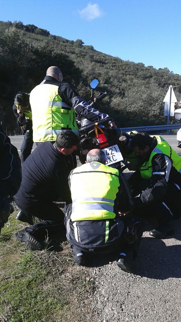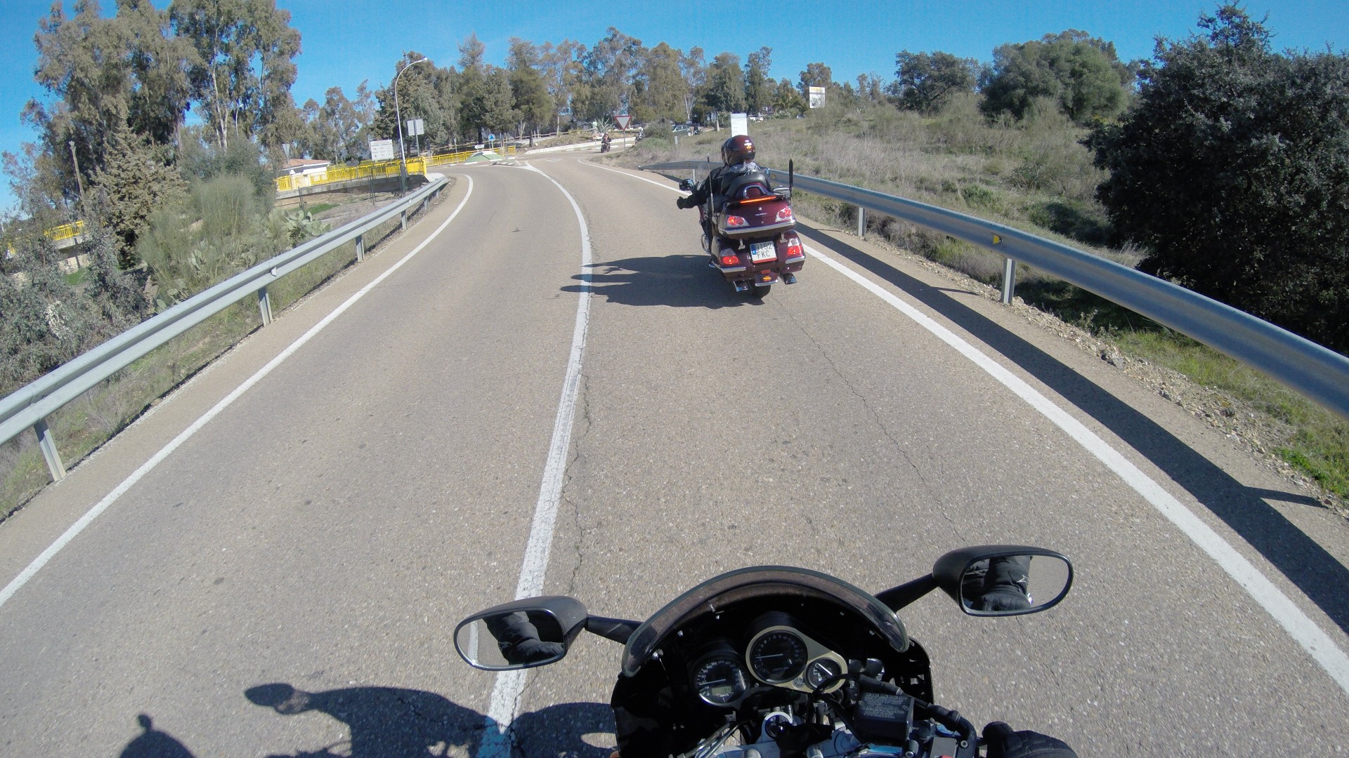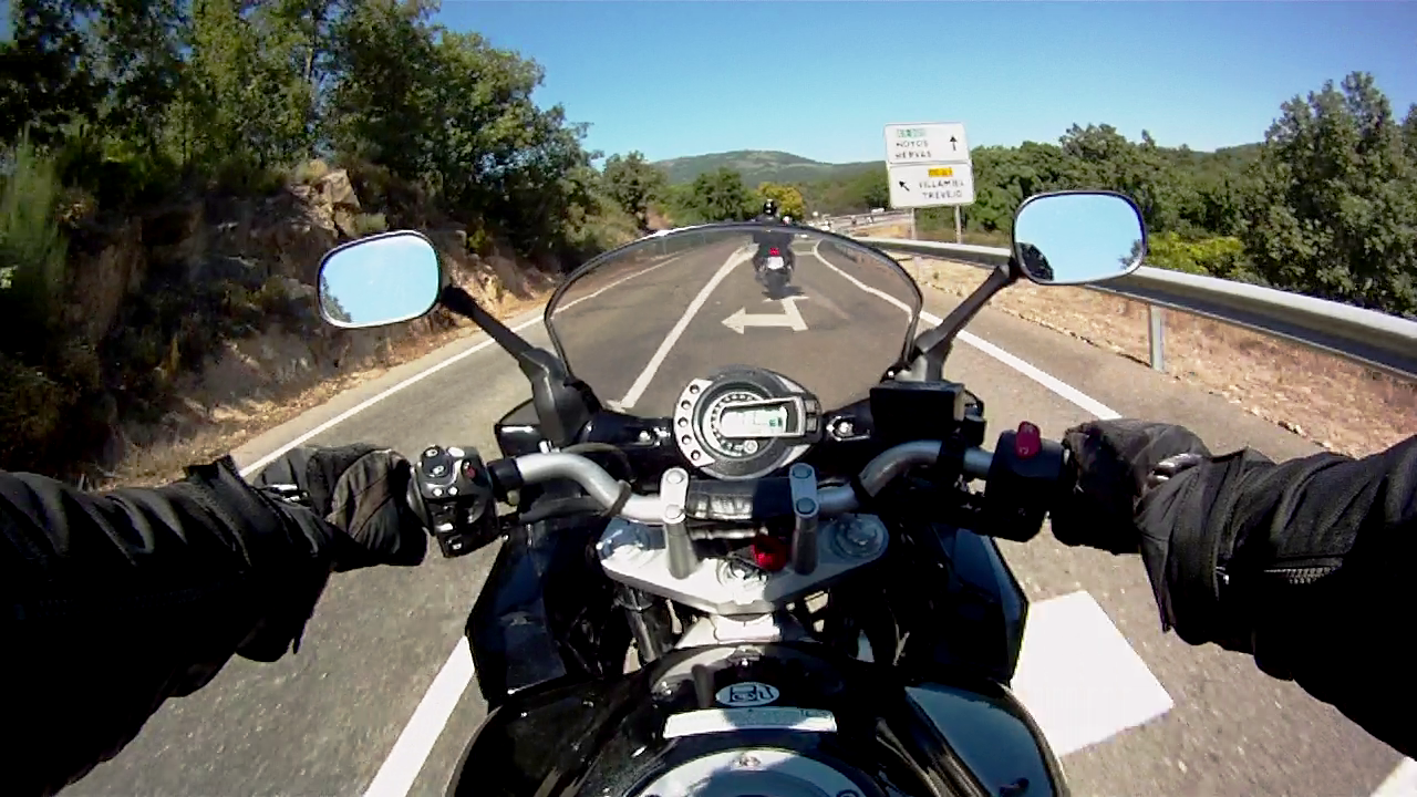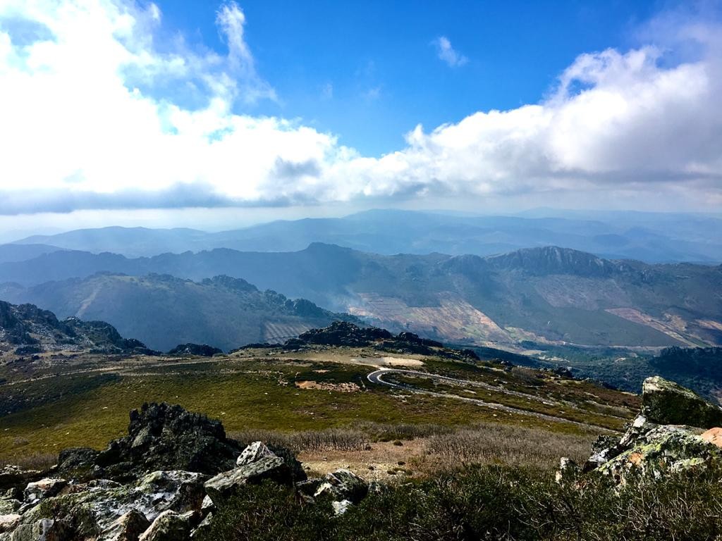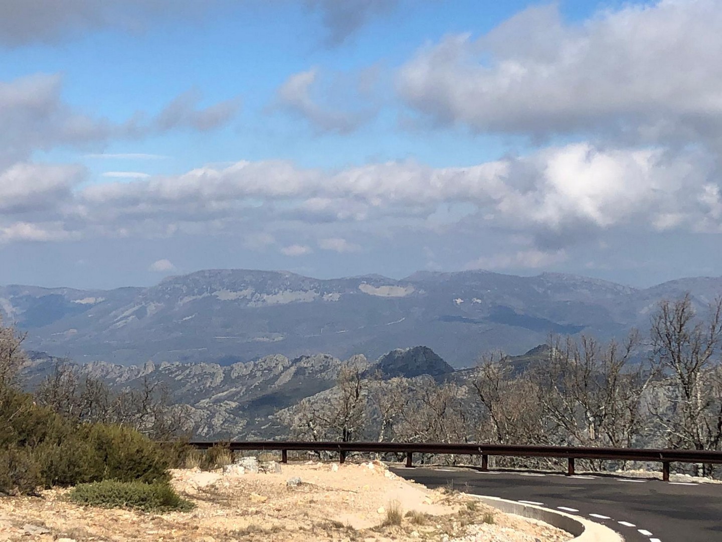 Por fin, después de dos intentos fallidos por la climatología, hemos podido llevar a cabo la ruta, y os aseguro que ha merecido la pena esperar. Hasta el café en Logrosán, nada que reseñar, una ruta de puro trámite, pero a partir de ahí todo cambió. Ya en Cañamero el cartel en el mismo desvío era buen augurio "Ruta paisajista" decía, y no se equivocaba. El asfalto en buen estado, las trazadas divertidas, los paisajes (el que te dejaba ver las pocas rectas) extraordinarios y así muchos kilómetros. Pedro y Amador nos sugirieron subir al pico de la Villuercas, a casi 1600 metros de altura, ¡Una pasada de vistas! mientras subías por una carretera recién asfaltada y desde arriba en la cima. Comimos muy bien en el Rte. Ximénez, en la misma travesía de Cañamero.